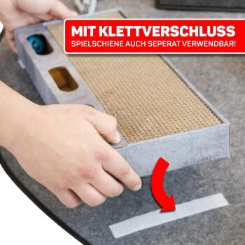 In jedem Tunnel, Turm oder Versteck des Teppichs sind Löcher, sodass Deine Katze mit der Pfote hindurchkommen und die integrierten Spielbüschel inklusive Glöckchen einfangen kann. Außerdem verfügt der Spielteppich COSMO über eine praktische Kratzfläche, auf der Deine Katze ihre Krallen wetzen und pflegen kann. Die Kratzpappe besitzt eine Spielschiene mit einem Ball inklusive Glöckchen, der zum Spielen animiert. Die Spielschiene wird mit durch ein eingenähtes Klettband am Teppich angebracht und kann bei Bedarf auch einzeln verwendet werden. Falls die Kratzpappe einmal ausgetauscht werden muss, bietet CanadianCat auch das passende Ersatzteil.