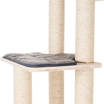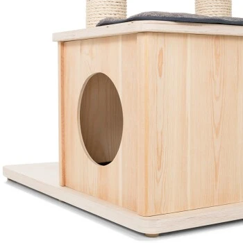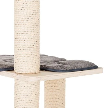 Die vier Kissen und das Bettchen sind mit Klettverschlüssen befestigt und waschbar. So behält das Möbelstück seine Ausstrahlung und bietet der Katze immer wieder einen sauberen Rückzugsort. Der Kratzbaum umfasst eine tiefe Höhle mit Kuschelkissen und vier Liegeflächen. Die Stämme sind mit hochwertigem Sisal versehen. An zwei Stellen wurde eine Spielmaus befestigt, die noch mehr Spielspaß garantiert und die Katze zum Kratzen anregt.