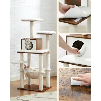 [Lässt sich nahtlos in Ihr Zuhause integrieren] Durch die Kombination aus Vintagebraun und schickem Weiß fügt sich dieser moderne Kratzbaum problemlos in die meisten Wohnstile ein und wertet Ihren Raum auf [Leicht zu reinigen] Auf der glatten, furnierten Oberfläche sammelt sich kein Fell und sie ist leicht mit einem Tuch zu reinigen. Die Kissen auf der Plattform und in der Höhle sind abnehmbar und waschbar, so dass Sie den Katzenbaum ganz einfach sauber halten können [Komfort auf höchstem Niveau] Die Kissen und die Hängematte bestehen aus 500 g/m² Plüsch – noch weicher und flauschiger als herkömmlicher Plüsch, damit Ihre pelzigen Freunde in ultimativem Komfort spielen, entspannen und dösen können [Langlebig für dauerhaften Spaß] Dieser aus Spanplatten gefertigte Katzenkratzbaum ist kratzfest und langlebig – er wird Ihre kleinen Fellnasen sicher lange begleiten und für anhaltende Freude sorgen [Stabil und sicher] Mit einer Hängematte mit Metallrahmen, Anti-Rutsch-Pads und einem Kippschutz ist diese Katzenwohnung mit einer maximalen statischen Belastbarkeit von 40 kg stabil und sicher für bis zu 4 Großkatzen (jeweils max. 7 kg) zum Auf- und AbsteigenFeandrea Hinweise: