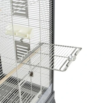 Die Optik besticht durch eine besondere Kombination aus den beliebten Pulverbeschichtungsfarben Antik und Platinum. Durch zwei Haupttüren (ca. 24x24cm) und jeweils zwei kleinere Türen (ca. 18x14cm) an den Seiten hat man für die Fütterung und Reinigung einen guten Zugang zum Innenraum. Im unteren Bereich findet sich das Kotgitter und die Streuschublade (ca. 57×53) welche durch eine besonders ansprechende Zierblende im geschlossenen Zustand geschützt werden. Durch die vier stabilen Rollenfüße kann dieses Vogelheim bequem auch Mal verschoben werden.