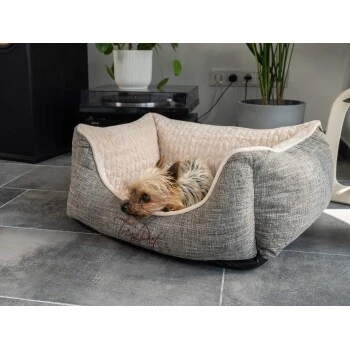 Das hochgepolsterte Hundebett ist in zwei Farbkombinationen erhältlich: Beiger Innenstoff und braun melierter Außenstoff / Grauer Innenstoff und grau melierter Außenstoff