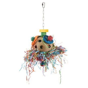 Es besteht aus einer Kokosschale mit Löchern in welcher ein Schredderball befestigt wird.